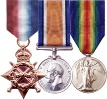 1914-15 STAR + BRITISH WAR MEDAL + VICTORY ALL DIE STRUCK COPIES SWING MTD